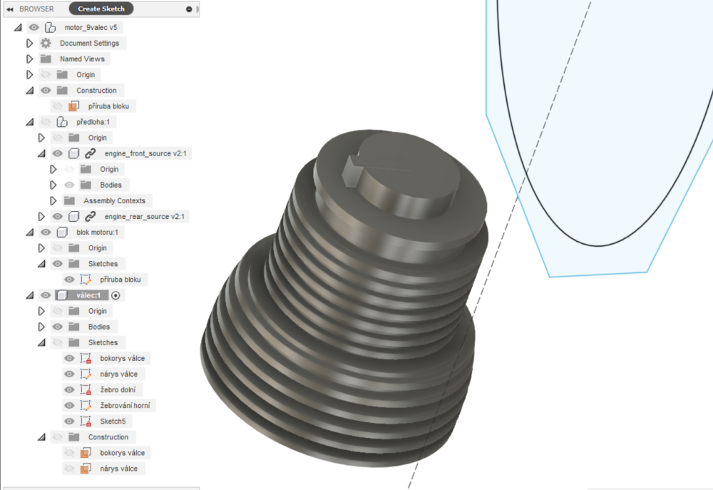 STL soubory jsem nathl do Autodesk Fusion, zmenil jsem je, protoe STL soubory se mi natahuj do Fusionu vt, ne maj bt, Sesadil jsem pedn a zadn dl makety motoru (STL model rozdluje motor na pedn a zdn st rovinou prochzejc vemi vlci), aby perfektn lcovaly a zaal kreslit svj vlastn model. Pvodn STL se stalo jen pedlohou pro mj vlastn model. Protoe u jsem si vyzkouel, e pro spn tisk je teba detaily motoru udlat mn detailn, snil jsem poet chladcch eber. Zrove jsem se rozhodl, e budu tisknou vlce jednotliv, zvl vlec a hlavu vlce, a samostatn sk motoru.
