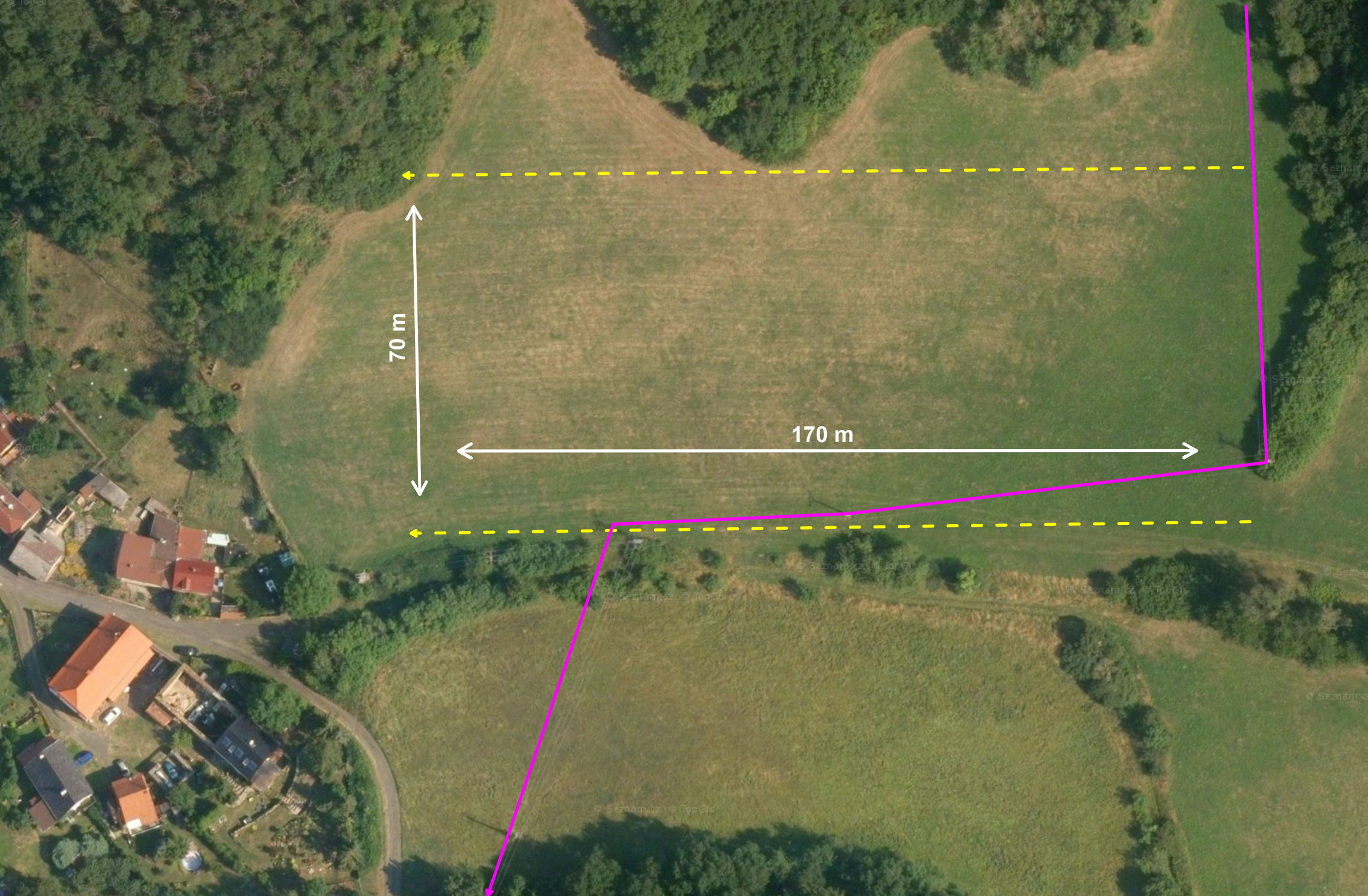 Šel jsem opravdu jen za humna a po pìti minutách jsem byl docela vyklepaný. Vítr pøes les a hlavnì hroznì málo místa! Les, vesnice, vedení vysokého napìtí. Tìch 70 metrù na šíøku je jen teoretických, není to tìlocvièna, abych odhadl jednotky metrù od kraje lesa nebo vysokého napìtí (fialová èára) a tìch cca 50 metrù je na tohle letadlo opravdu málo. Musel jsem výš a otáèet to až nad vesnicí a nad lesem. Než jsem vylítal baterku, byl jsem sklenìnej zimou.