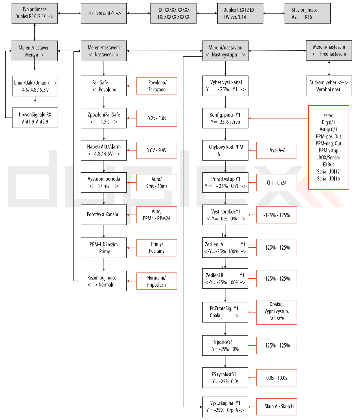 Failsafe se nastavuje pøes Jetibox nebo pøes jeho emulaci ve vysílaèi. Do emulace se dostanete z hlavního menu vysílaèe pøes volbu Aplikace a Jetibox. Jetibox zobrazuje menu pøijímaèe, pøijímaè tedy musí být zapnutý a musíte si ho v menu Jetiboxu najít. Ve vlastním menu se dá potøebné najít metodou pokus omyl, ale je lepší mít pøed sebou strukturu menu a doskákat na správné místo rovnou. Viz obrázek.