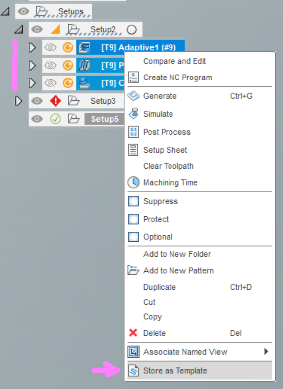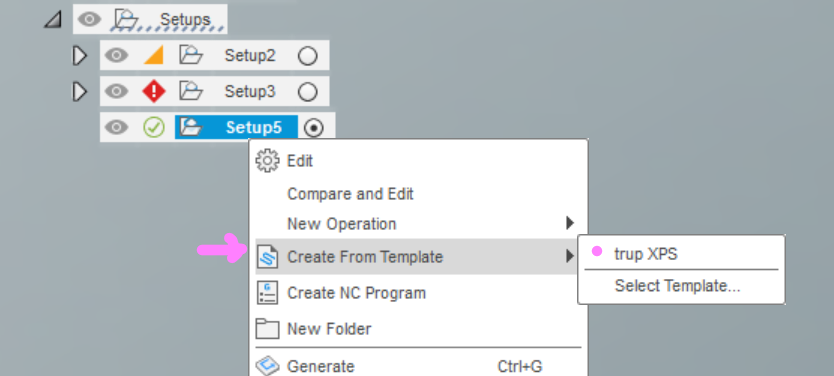 Pøi založení nového setupu ve workspace Manufacture mùžete kliknout v browseru nalevo na nový setup pravým tlaèítkem myši, vyvolat kontextové menu a v nìm zvolit Create From Template a natáhnout si do setupu pøedpøipravené operace, celou sadu operací.
