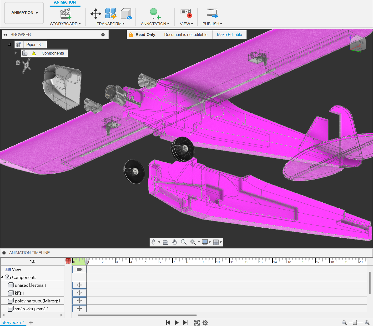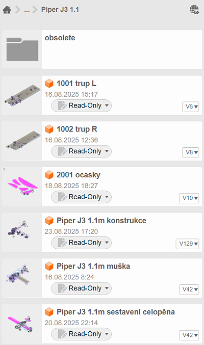 Prùbìžnì kontroluji, jak mám co vymodelováno. Mám návrh Piper J3 1.1m sestavení celopìna a v mìm kontroluji vymodelované díly.