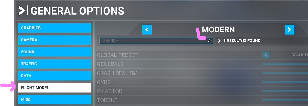Letadlo se po odlepení od zemì rozkýve do stran a kniplem ho nelze udržet, uøídit. Hledal jsem v diskuzi forums.flightsimulator.com a našel øešení. Je tøeba v nastavení General Options - Flight Model nastavit MODERN.