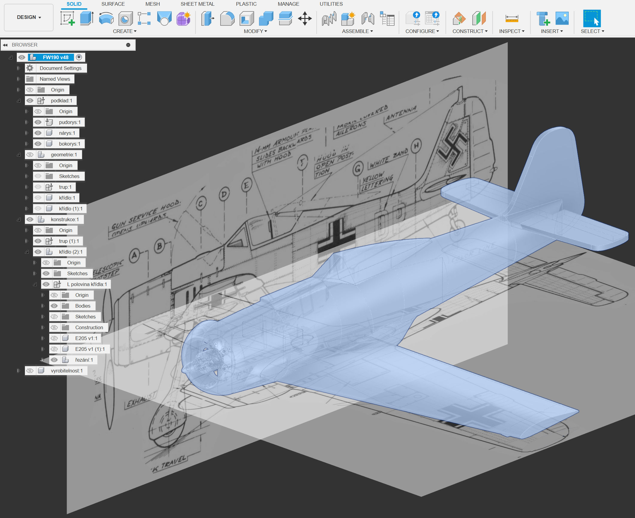 - FW190 je nvrh, kde nad tpohledovm nkresem zskanm z asopisu, z knihy, z internetu modeluji geometrick tvary letadla a modeluji konstrukci modelu.