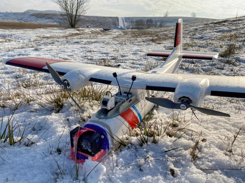 Kamera GoPro Hero 10 Black patøí na pøedek. Není to tak ale jednoduché, je potøeba poøešit rozvážení letadla, baterka v kabinì v nejzašší zadní pozici tu kameru vepøedu nevyváží.