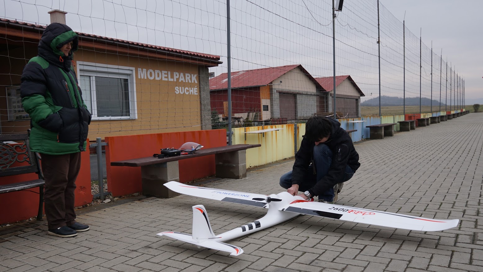 Jardovi se do vzduchu s jeho velkým "filmovacím" letadlem (2600FPV - foto) moc nechce, nezdá se mu terén ani vítr, ale nakonec se nechá ukecat. Stojím u nìj, trochu mu radím a ono to jde lépe, než Jarda èekal. Let konèí pìkným pøistáním a asi se mu to tu už nezdá tak tìžké.