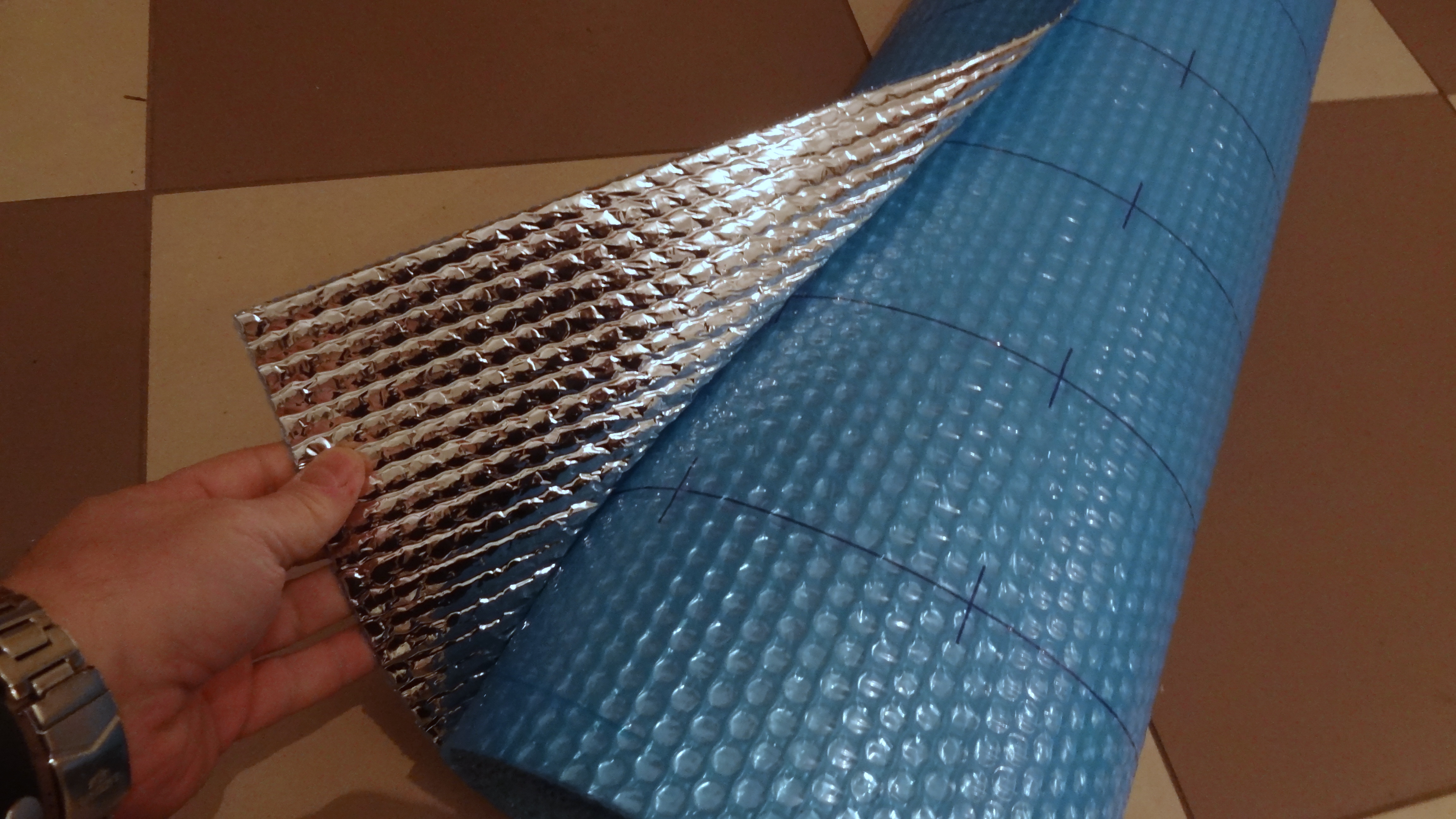 | popis: | Fólie široká 1.0 m. Z jedné strany je hladká støíbrná plastová fólie a z druhé strany jsou plastové bublinky. |