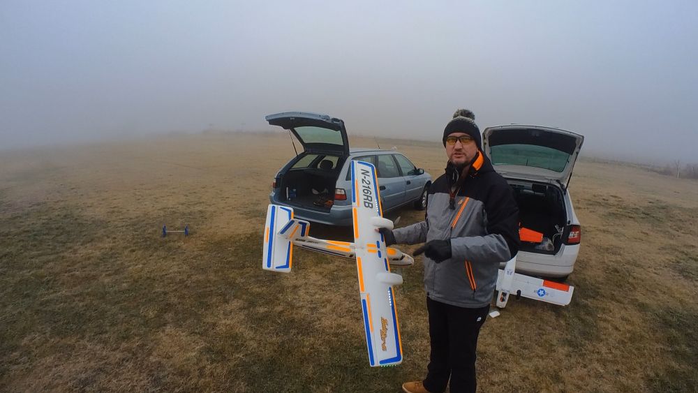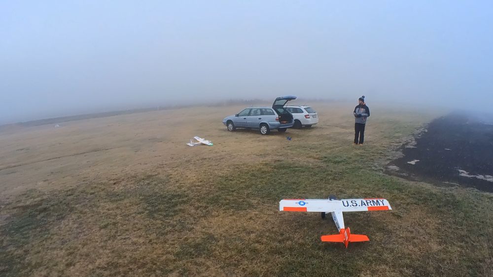 Doposud bylo kolem pìti stupòù a na létání nebylo tøeba se tak navlékat. Dnes je -0.5, na silnici k letišti bylo náledí a tak jsme s Karlem oba navleèení ve více vrstvách obleèení a hlavnì v teplých botách.