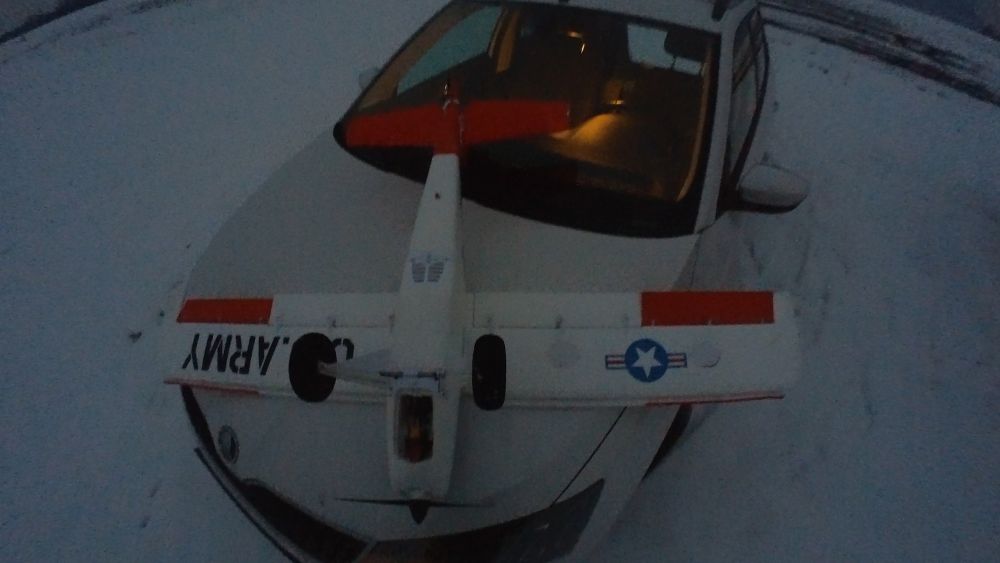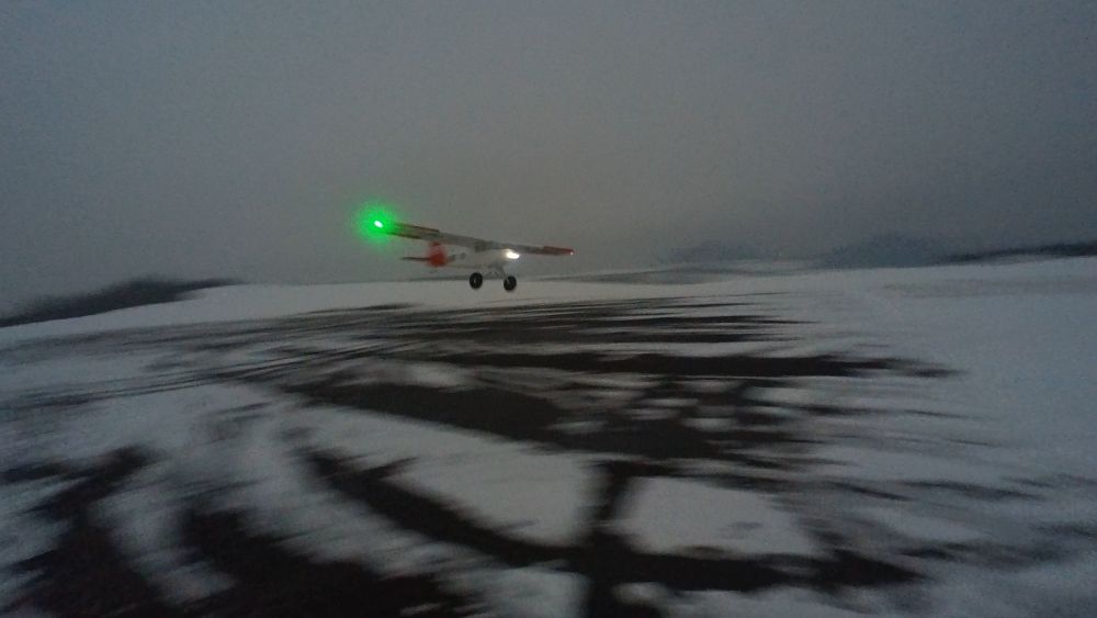 Všechno okolo nás spí a to ticho okolo podtrhuje zvláštní akustika zasnìžené krajiny. Karel má zase Twin Stara, já mám zase Timbera. Karlovo letadlo vypadá v tom ranním šeru jako vánoèní stromeèek, já mám na letadle jen pozièky a reflektor vepøedu, vypadá to v té tmì opravdu realisticky.
