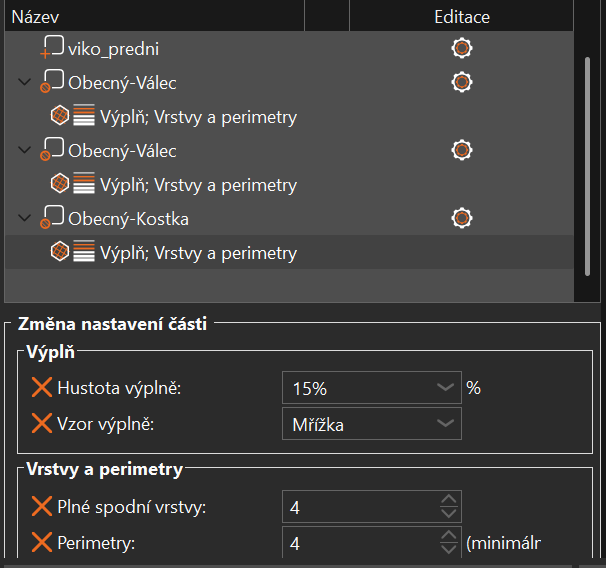Modifikátor mùže zmìnit nastavení parametrù tisku v urèitém místì. Pøíklad: tisknu bez horní vrstvy, ale i krajù jsem potøeboval nejen tu horní vrstvu ale i vìtší hustotu výplnì.