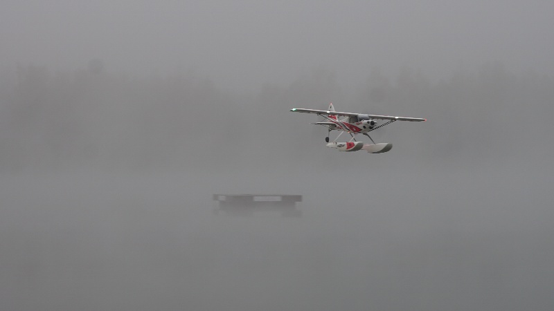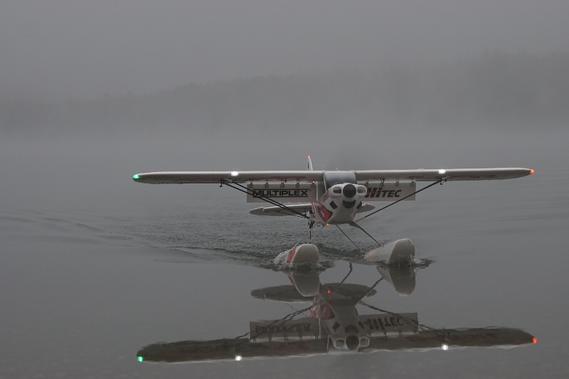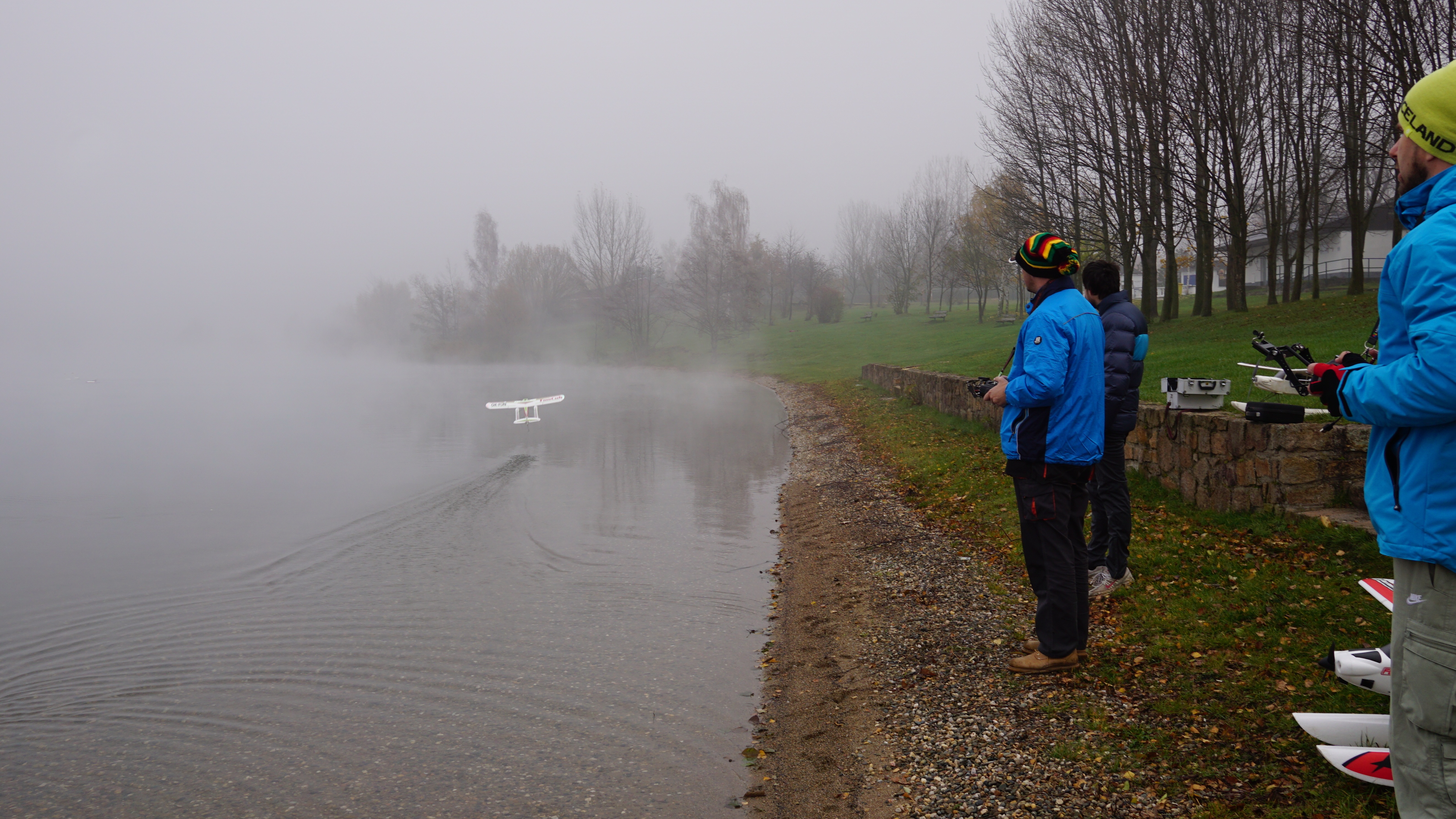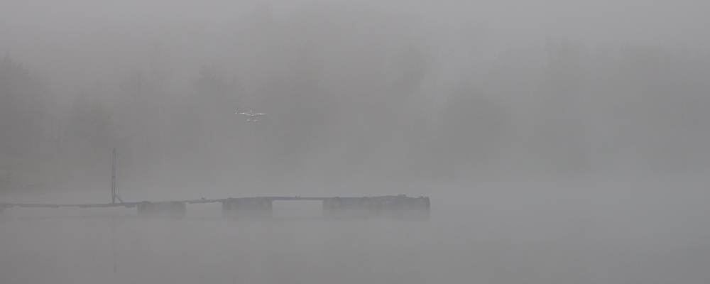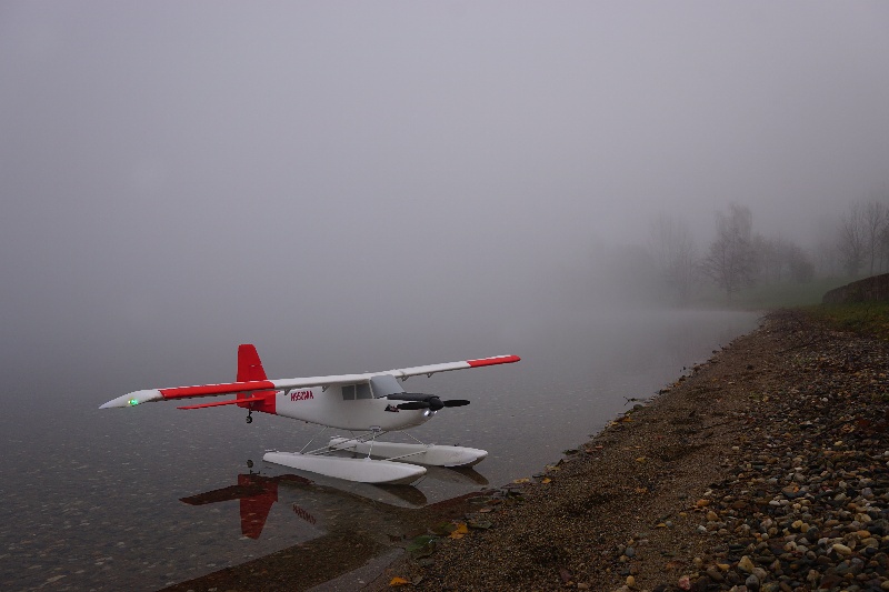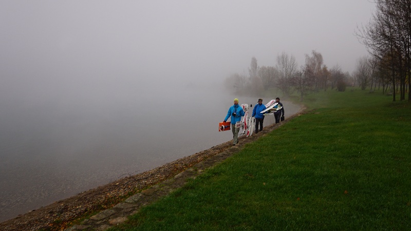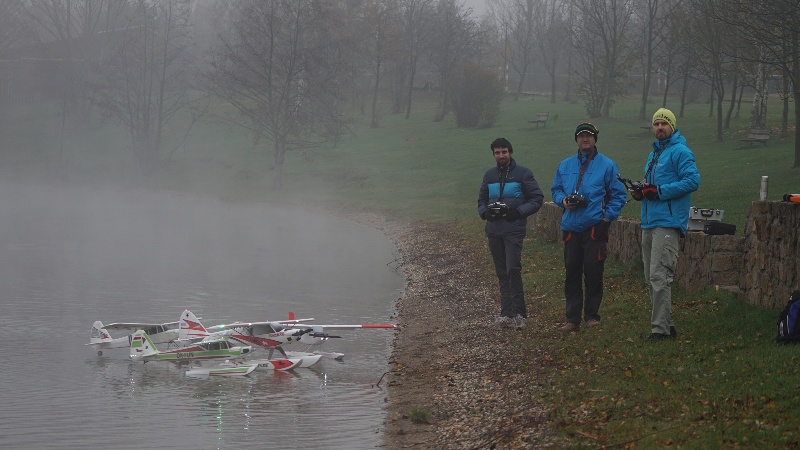 Je bezvìtøí, hladina jako zrcadlo. Po vzletu letadla blednou v chuchvalcích mlhy, je tøeba vèas zatoèit. V mlze mizí i rozhraní vzduchu a vody. Létáme spoøádanì levé okruhy, ruce na kniplech nám trochu mrznou, obèas zalétneme trochu dál a letadla se nám skoro v mlze ztrácí. Na nìjaké velké blbnutí to není. Já pøi létání myslím trochu i na to, že není možné pro letadlo lézt do vody. Dno tu padá rychle do velké hloubky a plavat v té studené vodì nedokážu.