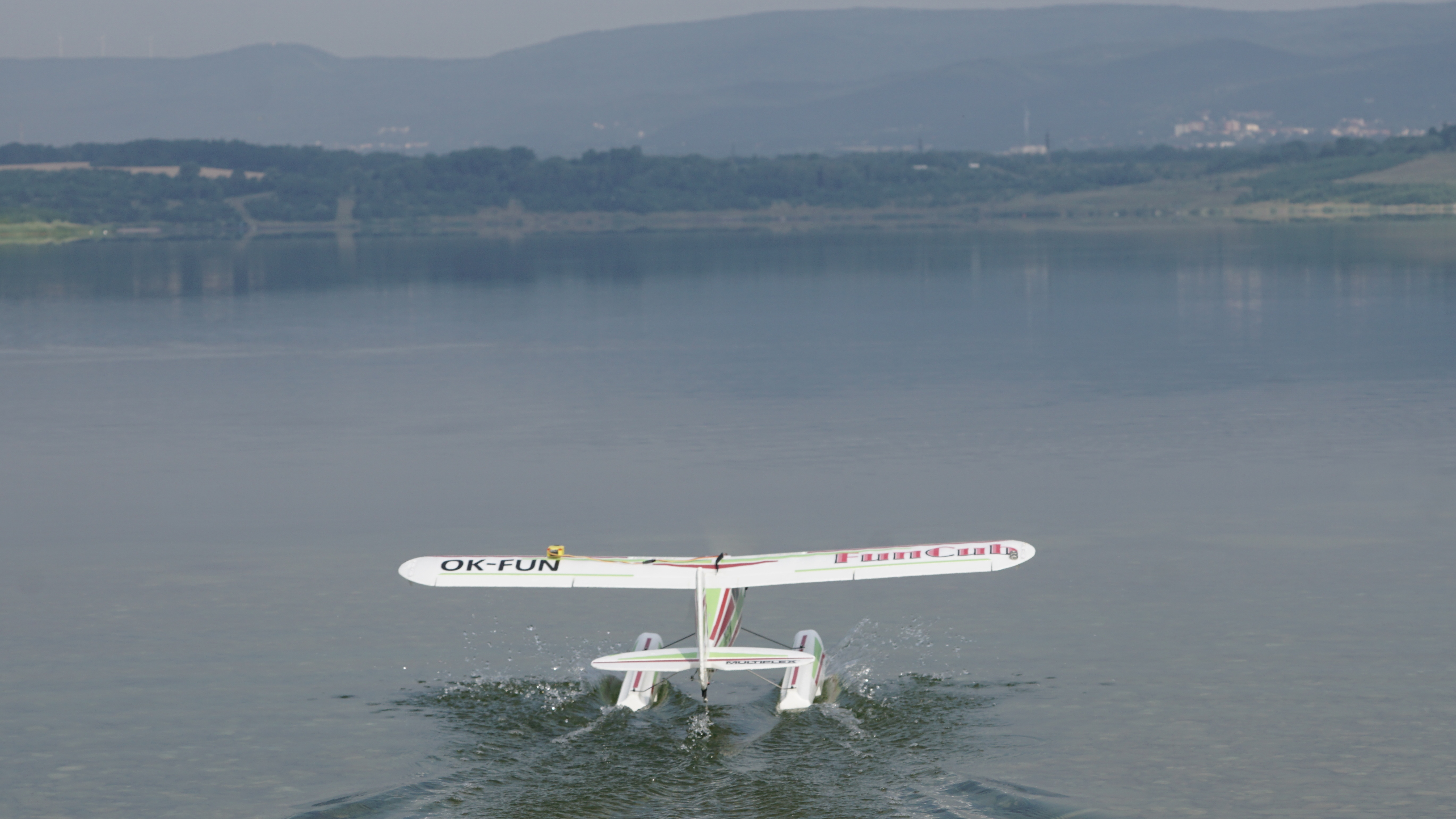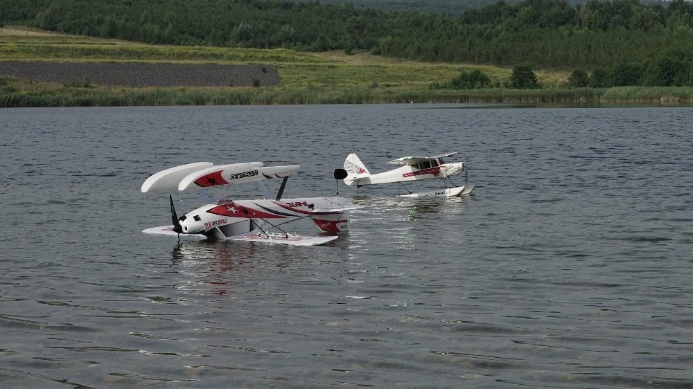 Mì v té filmovací náladì v jednu chvíli napadá, že poletím nízko podél bøehu ve "skoronožáku". Nápad konèí hned na zaèátku. V náklonu cca 60 stupòù jsem se v mžiku sesunul k hladinì a zavadil køídlem o vodu, pøesnì øeèeno jsem se køídlem zaøízl do vody. Køídlo to zastavilo a letadlo švihlo èumákem kolmo do vody. Rána veliká. Letadlo zùstalo na vodì na zádech a výškovka i smìrovka jsou hodnì za roh. Na bøehu to zkouším, vypadá to, že jsem dolétal, buï se stalo nìco se servy nebo s pøijímaèem. Vìnuji se dál fotografování.