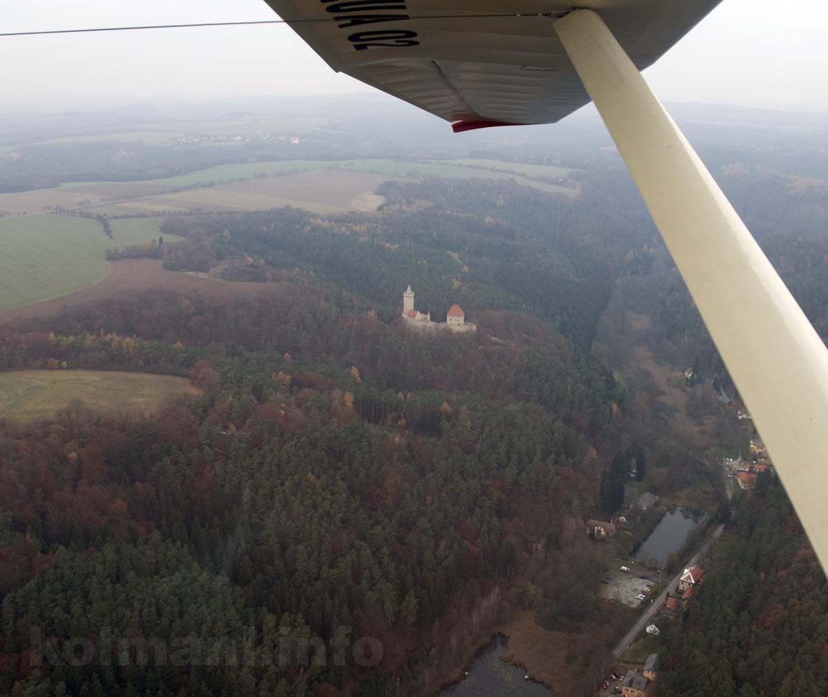 Obloha je zataen, vzduch je siln zakalen a let i v mal vce nad ternem je naprosto klidn, bez drncn, bez turbulenc. Krajina pod nmi vypad v tom pe zasmuile. Barevn list na stromech se sna trochu krajinu rozveselit, ale podzimn nladu nedoke zahnat.