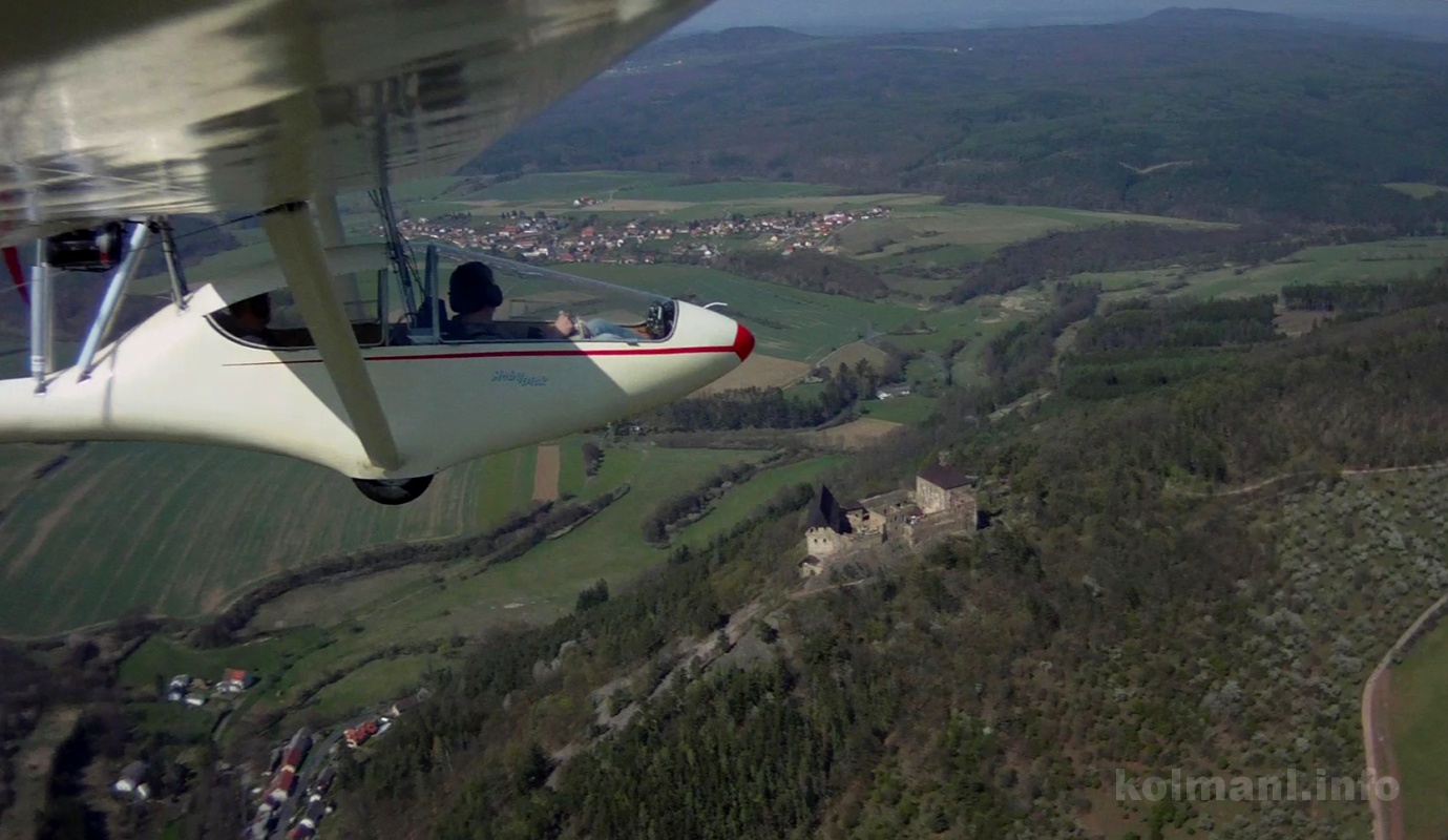 Kamera bc na konci kdla zatm nevidla nic zajmavho, kdy pominu ns dva v kabin, jak civme z kabiny ven. A u Berounky. Domlouvme se, jak "poletme Kivoklt", aby byl v zbru t venkovn kamery. Zkal je sice opravdu velk a nic svtobornho nevznikne, ale my si to alespo nacviime. Honza dl krouek, sname se o Kivoklt i o dol Berounky, ale je to njak patn. Asi jsme si s Honzou nerozumli. Jsem zvdav co na zbru bude, nevm jet, jak moc kamera zabr prostor okolo letadla. Letme dl.