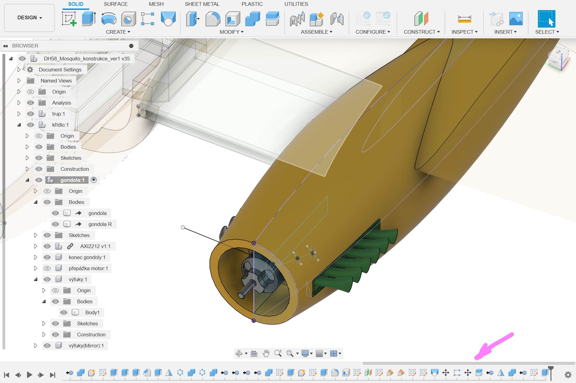 Pøepínáním na jednotlivé komponenty (na obrázku je aktuální "gondola") vidím dole èasovou osu jen této komponenty a mohu operace po ose pøesouvat. Jak se ale zorientovat v tom, co na èasové ose patøí které komponentì?