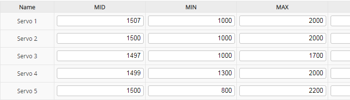 Když si v INAV v Outputs - Servos nastavíte støedy poloh serv MID, mùžete je najít po letu zmìnìné. Já jsem si serva nastavil na støedy 1500 ms a mechanicky pošteloval táhla, aby kormidla byla v neutrálu. Po letu jsem našel v nastavení tyto hodnoty: