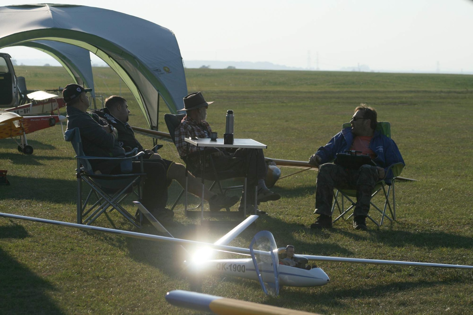 Kdy u ostatn odneli modely do hangru a sphali do hospody na jdlo a na pivo, Thomasv Jak-18A zstal stt na ploe. Je to ji takov tradice na Ran, e Thomas a jeho kamardi na zvr letovho dne nco pedvedou. Slunce u zapadlo cel za horizont, rozsvtila se pozin svtla Thomasova Jaka a za chvilku u jsme slyeli bublav zvuk jeho motoru a vidli krsn realistick vlek Blanka jeho kamarda do vky nad Ranou do svahovho proudn. Blank zmizel v eru ve vinch a Thomas brzdil volnou oblohu v pknm realistickm letu. Na zvr m ohromil letem nad pistvajcm Blankem - as 2:50. image