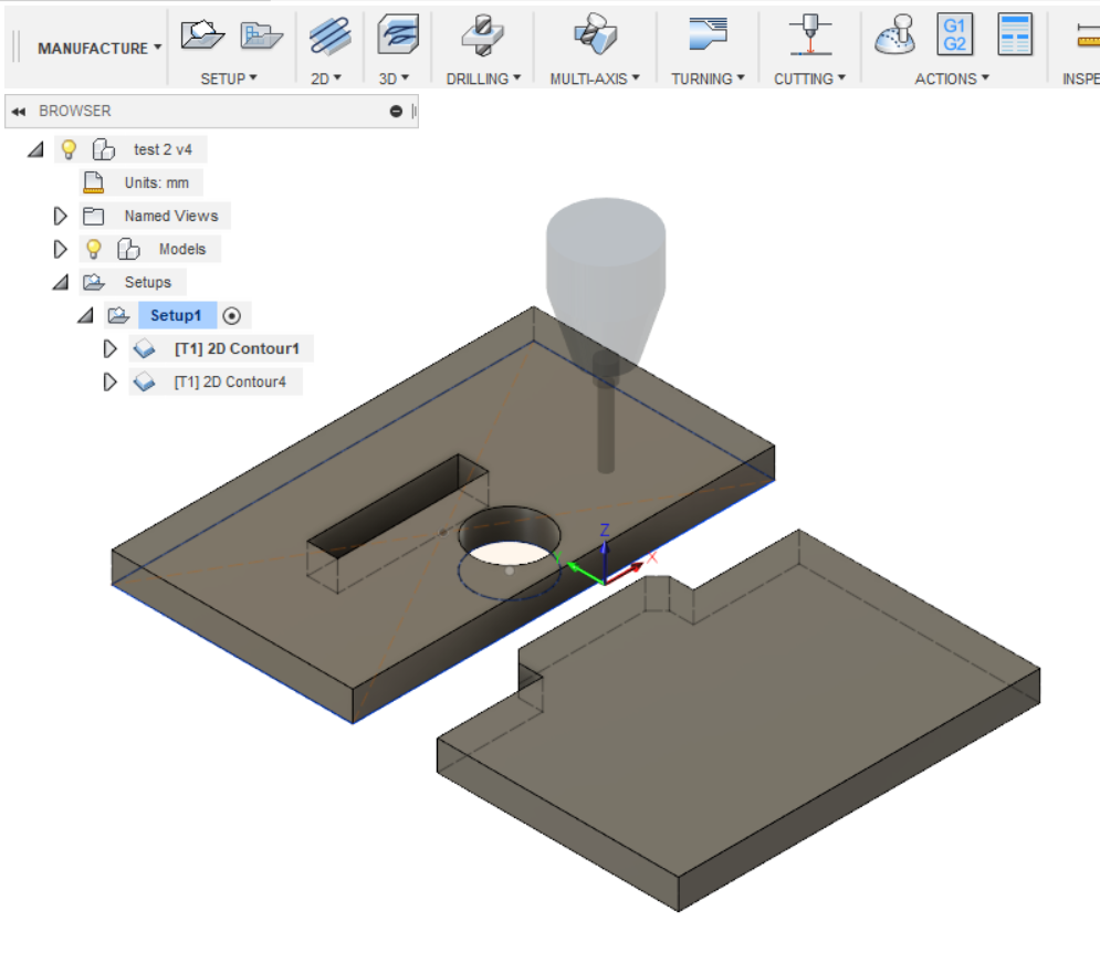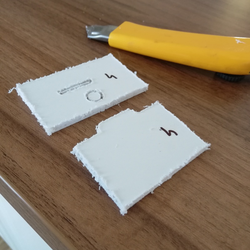 Vytvoøil jsem si dva zkušební díly a vyrobil jsem na nich zámek, abych vyzkoušel, jak zámek bude fungovat, jak pùjdou díly k sobì sestavit. Øezal jsem frézou 2 mm: