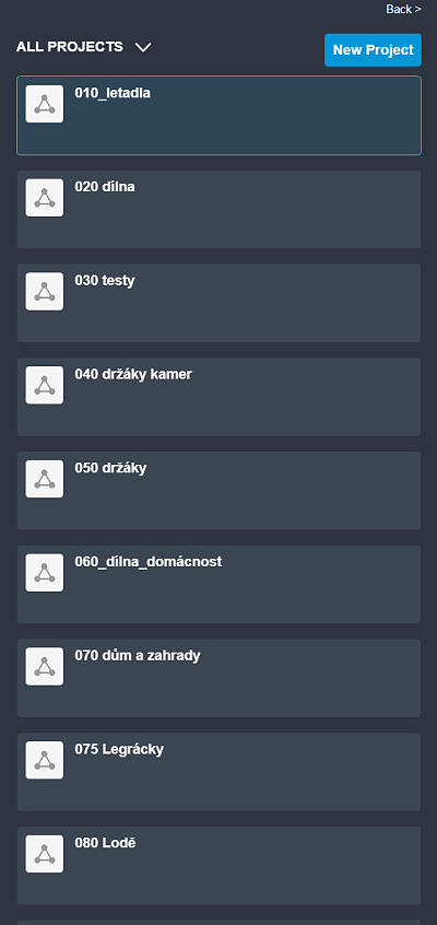 Strukturu ukazuje obrázek nahoøe. Svùj svìt jsem si rozdìlil do oblastí, které spolu nemají nic spoleèného. Tedy nic spoleèného z hlediska modelování. Napøíklad modely letadel a vìci do dílny. A pro tyto oblasti jsem si založil projekty: "letadla", "dílna", "domácnost" ... A v tìch projektech mám vše, co vzájemnì v modelech používám. V projektu letadla mám modely letadel i vìci, které v tìch modelech používám: serva, motory, akumulátory, koleèka atd.