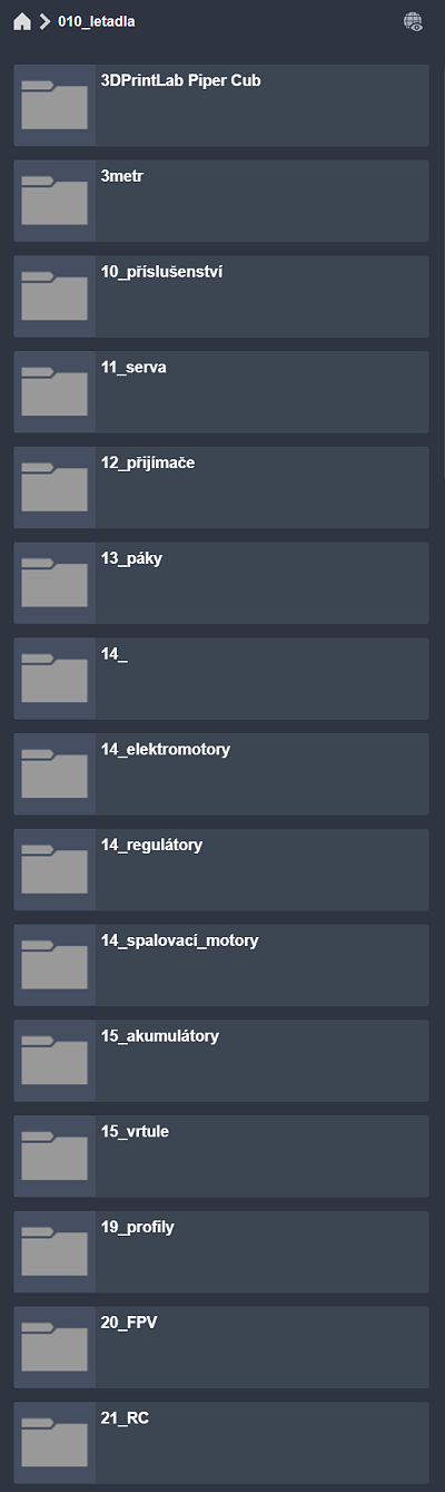 Aby to nebyla jedna nepøehledná hromada, mám to ve složkách. Mám složky pro serva, motory, akumulátory, koleèka, profily køídel ... prostì vše, co pøi modelování letadel používám.
