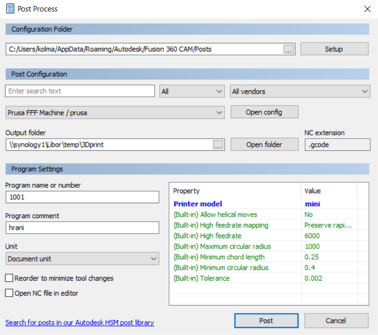 Pro vygenerování g-kódu pro tiskárnu je tøeba stáhnout a do Fusionu nainstalovat její postprocesor. (cam.autodesk.com/hsmposts)