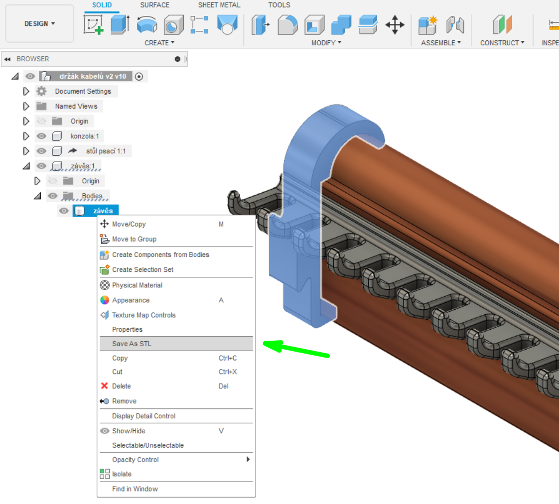 V browseru nalevo vyberete tlo objektu (bodies), kter chcete exportovat, a v kontextovm menu vyvolanm pravm tlatkem myi zvolte Save As STL. Mete zvolit detailnost generovanho modelu.