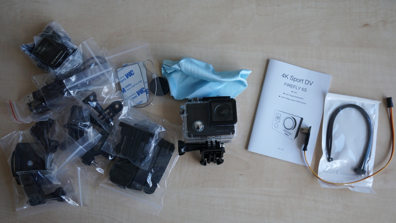 Hawkeye Firefly 6S kamera je zabalena v pomrn velk krabici. Krabice s kamerami GoPro jsou podobn velik, kdy ale kameru GoPro z krabice vybalte a chvli na to koukte, dojde vm, e mte kameru, ale jaksi nemte m ji upevnit. Jsou u n sice nalepovac drky, ale kdo by nkam hned lepil drk, kdy jet nev, jak s kamerou bude pracovat. To z thle krabice se vysypalo plno uitench vc, drky, kter jsem ke GoPro musel teprve podit!