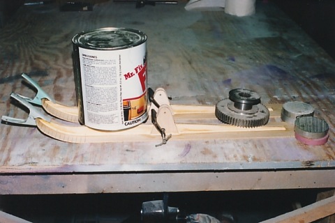 Uchycení režnou nití do odtokovky špendlíkem a gumou 6x1 do nábìžky taky špendlíkem. Jelikož se jedná o velmi krátkou a sezónní záležitost, nechtìl jsem uchycení vìnovat více pozornosti. Lyže na zadním kole je pouze z boku nasunuta a fixována opìt dvìmi špendíky.