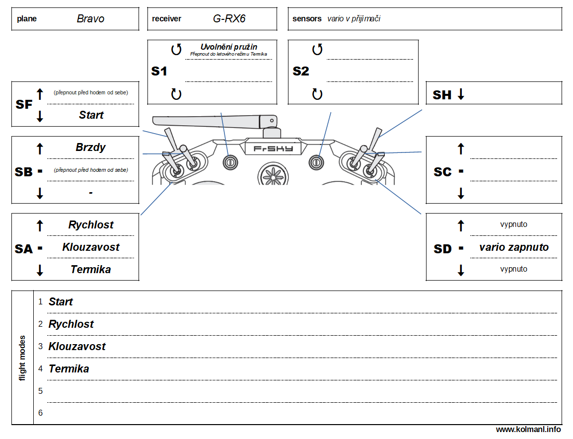 Letové režimy jsem zvyklý ovládat pøepínaèem SA, šablona používá stejný pøepínaè, nemusím nic pøedìlávat, nemusím se pøeuèovat. Pøijímaè mám zapojený: