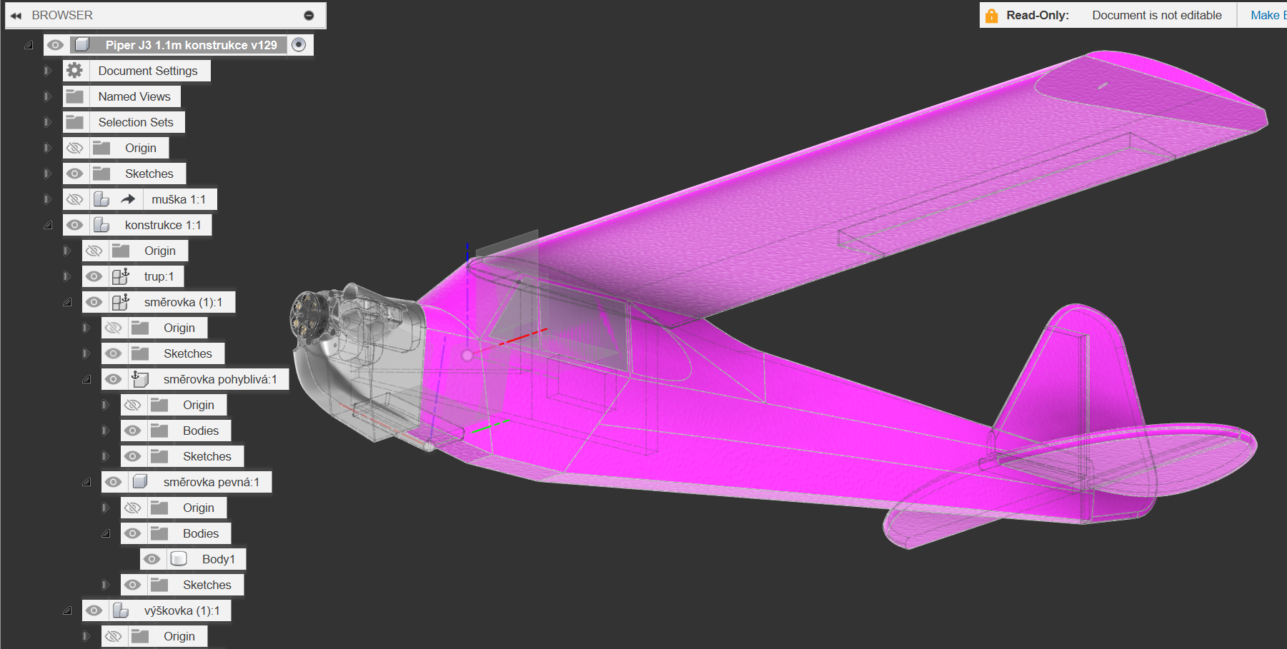 Mám návrh Piper J3 1.1m sestavení celopìna a v mìm kontroluji vymodelované díly.