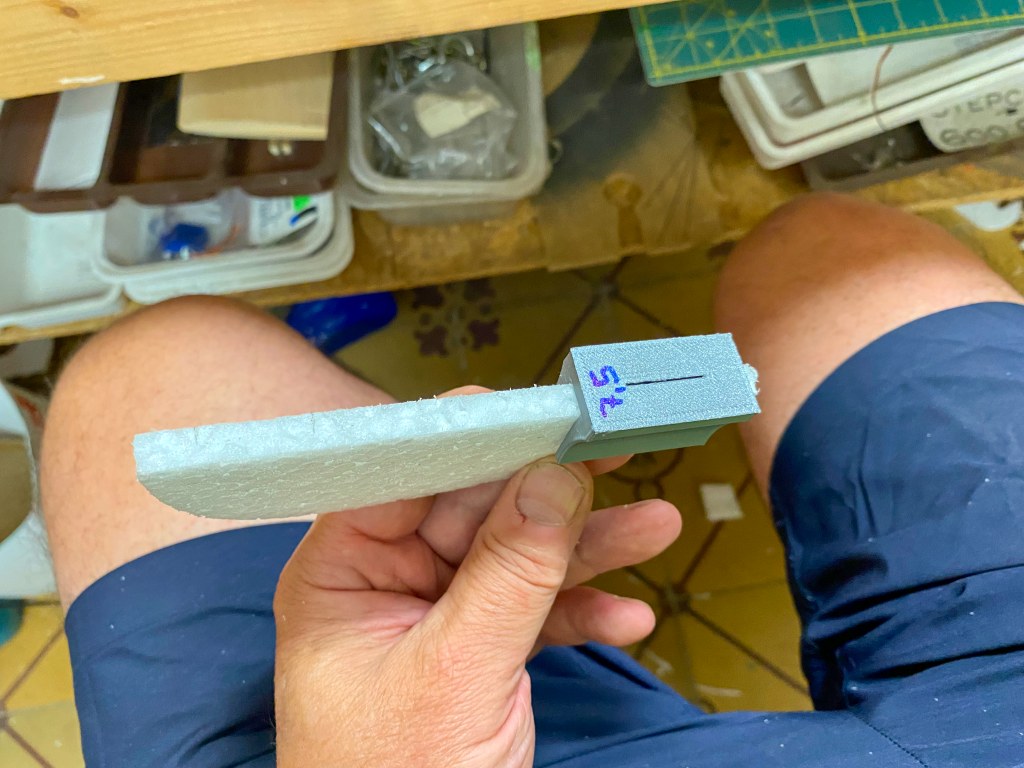Kdy jsem ezal ocasn plochy, vzal jsem plt EPP, kter jsem koupil v modelsk prodejn. Mlo by to bt EPP tlouky 7 mm, ale realita je 7.5 mm. Pro panty jsem poteboval vyznout kapsy. Abych to udlal pesn, nakreslil jsem si v Fusionu a na 3D tiskrn vytisknul ppravek.