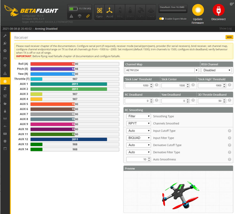 a kablky pjenm propojil. Firmare na kartu v rdiu, pepnout vysla do modu Flash external device, docela dost dlouho to trv, ale kon to spn. Odpjel jsem kablk s konektorem do vyslae, pipjel kablk, kter jsem nael v balen flight controlleru. Pipojil jsem pijma k FC na UART2 a sproval pijma s vyslaem.