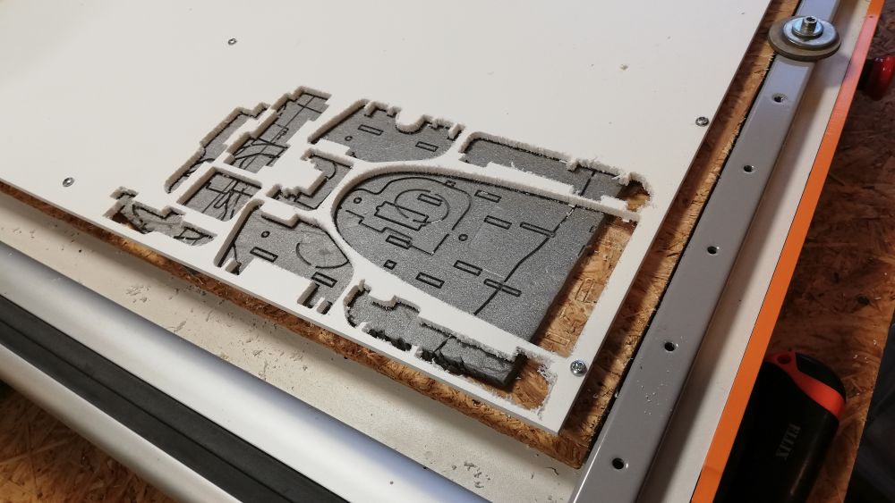 Na desce mm nakresleny ry, podle kterch pez snadno srovnm s osami stroje. Dleit je mt rzn dlouh rouby a pouvat je podle tlouky materilu. A taky mus mt rovnou dosedac plochu, rouby s kuelovou hlavou materil pezu snadno roztrhnou. Deska slou dlouho, rozvrtat ji rouby a rozjezdit elem frzy trv dost dlouho.