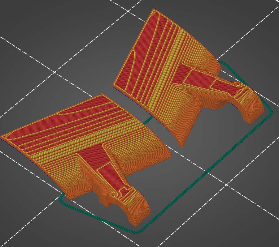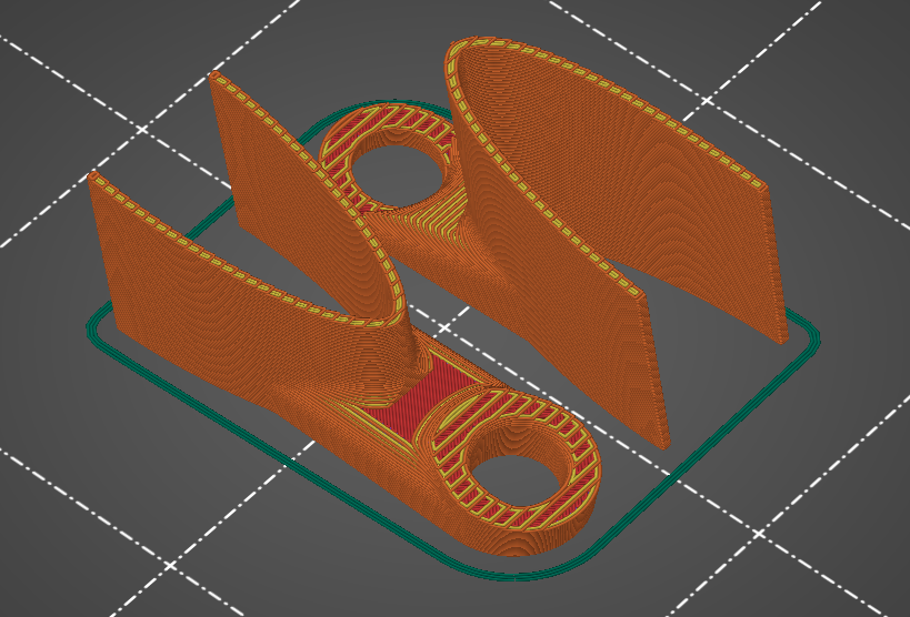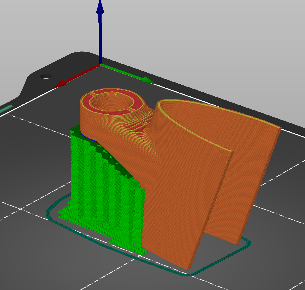 Tisk na podpìrách ale zvyšuje spotøebu materiálu a hlavnì prodlužuje dobu tisku. Díly se tak èasto vhodnì rozøíznou tak, aby jednotlivé èásti šly tisknout bez podpor. Tøeba jako na tomto obrázku: