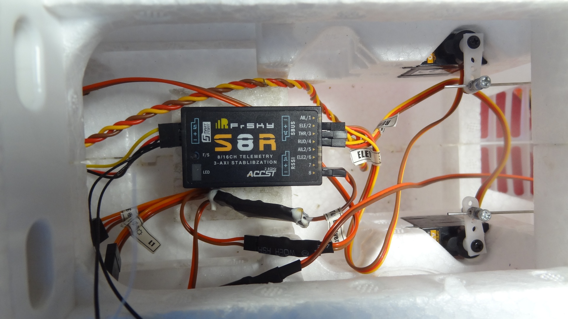 Pøijímaè FrSky S8R jsem upevnil suchým zipem na dno trupu pod nábìžkou køídla. Leží tady také deska øízení osvìtlení letadla, na kterou jsou pøipojena pozièní svìtla, èervené majáky na trupu a záblesková svìtla na koncích køídla.