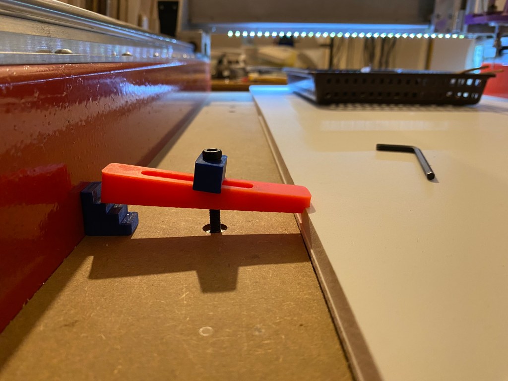 Abych mohl jednodue na stl stroje nco upnout, pouvm zvrtn matice M5. Stroj, kter provozuji m desku z MDF a na stroji pedtm jsem si na desku stolu dval svoji desku z MDF.