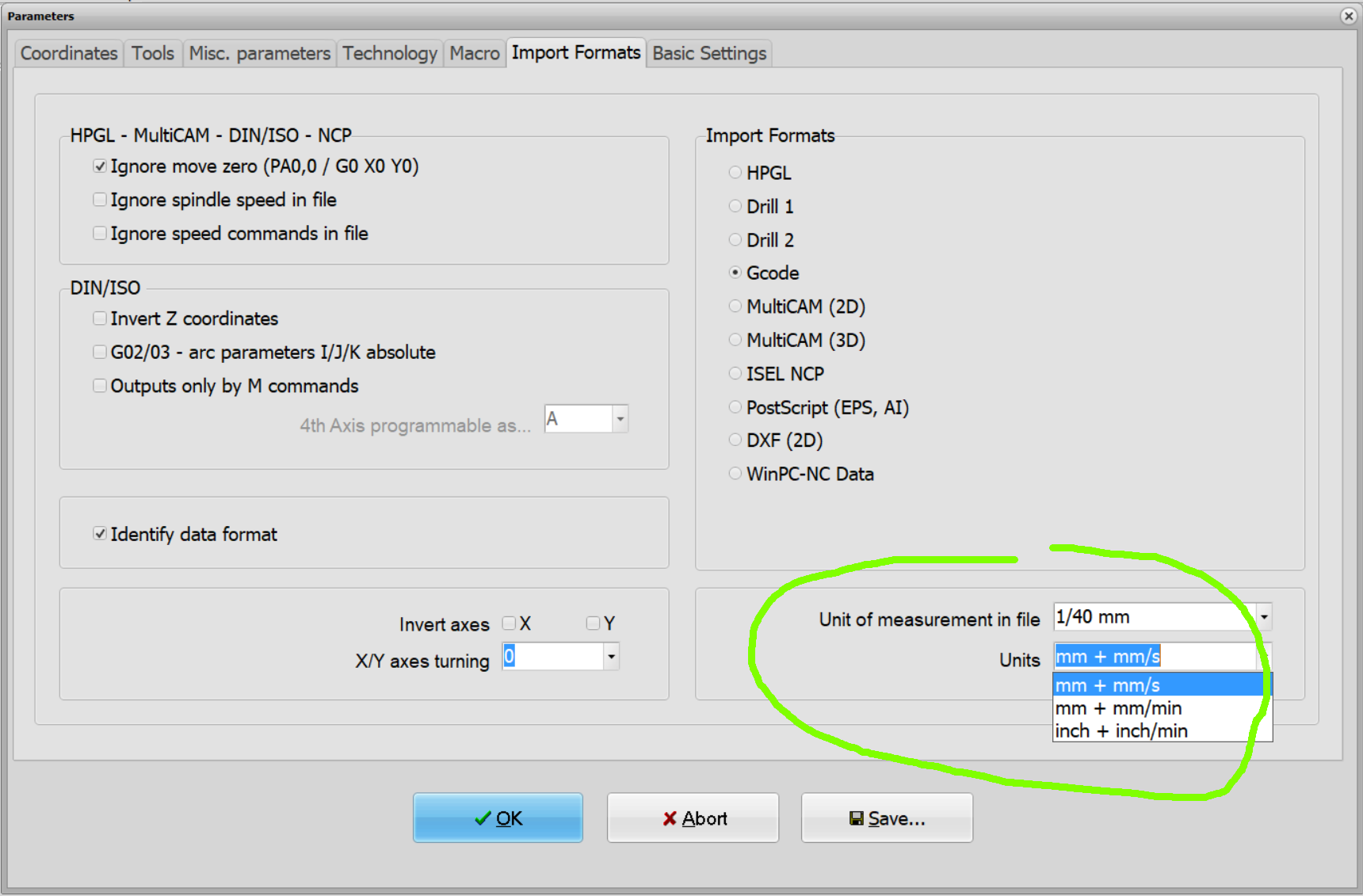 postprocesor interpretuje mm/min jako units/min.