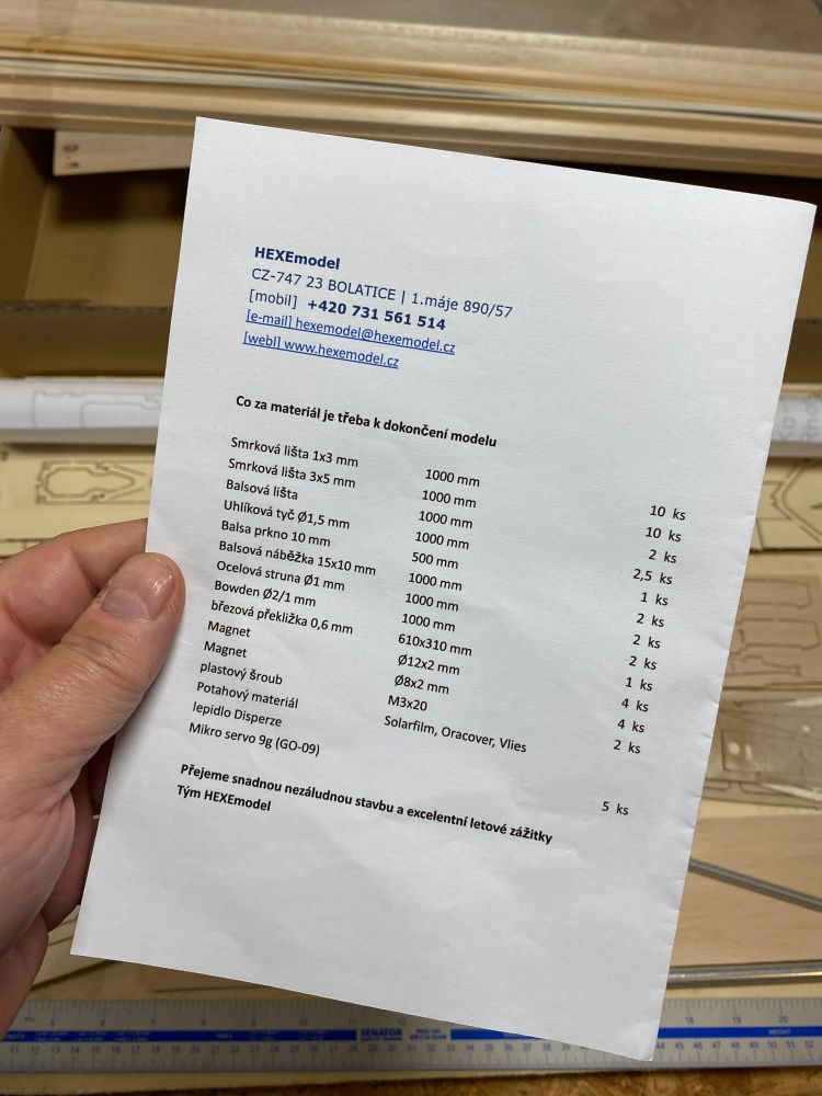 Stavebnice je short kit, obsahuje díly, které dodavatel nìjak opracoval, a pøedpokládá se, že materiál na díly, které se øežou na rozmìr a opracovávají se do tvaru až pøi stavbì, si stavitel dokoupí sám, nebo je má ve své dílnì. Podstatou short kitu jsou vyøezané pøepážky trupu a žebra køídla.