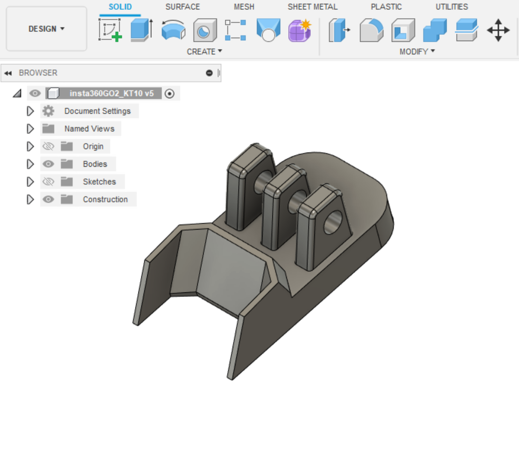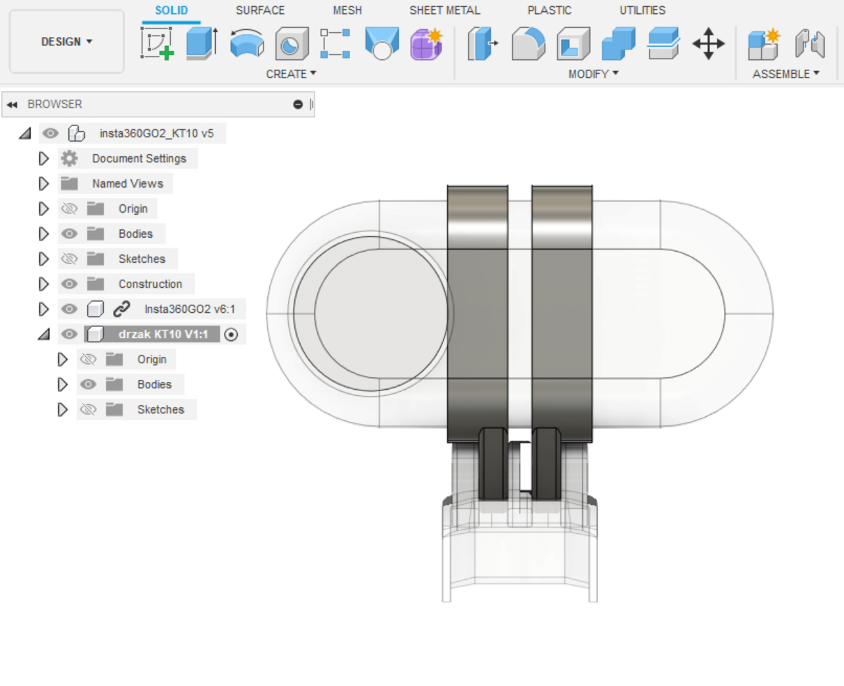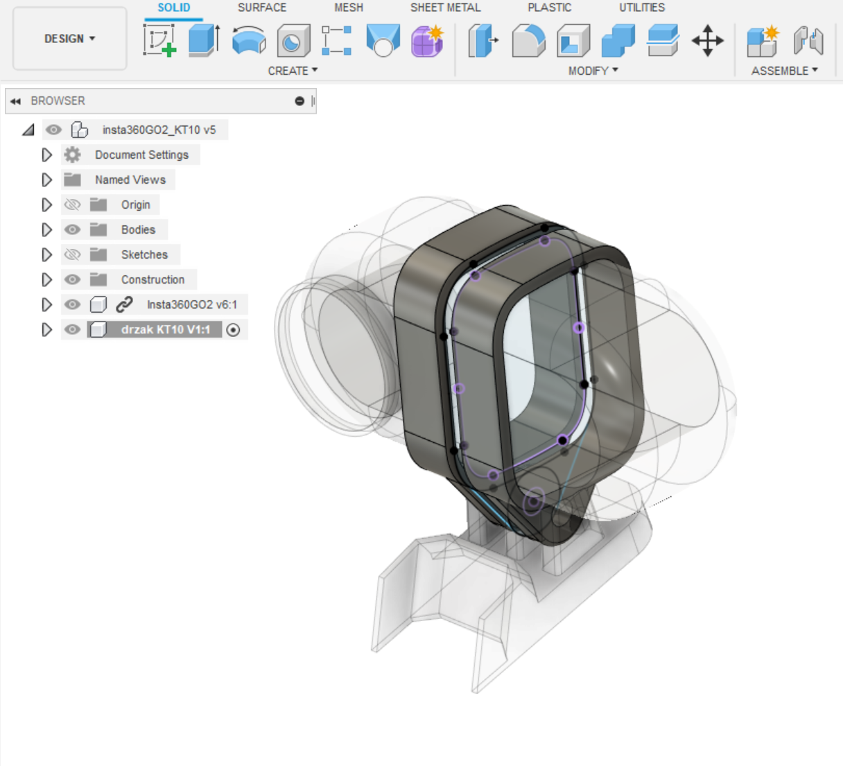 Potom už šlo jen o to vymyslet a vymodelovat držák kolem kamery a úchytu na kopteøe tak, aby to šlo vytisknout, aby to mìlo dostateènou pevnost a aby to bylo praktické.