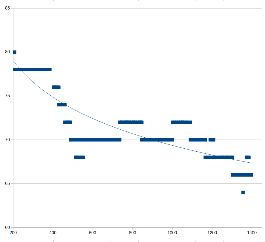 Zkuebn let probhl bez problmu, rdio fungovalo jak m. Jen jsem v modelu - nastaven ve vyslai, kde jsem ltal pijma x4R a potom a G-RX8, povolil msto internho vyslacho modelu 2.4GHz extern modul a vkon nastavil na 25 mW. Zarazilo m, e RSSI u pi mal vzdlenosti pokleslo ze 100 na 80, ale v prbhu letu a i pi dalch letech jsem se dopracoval nzoru, e graf uveden v diskuzi na FrSky foru (https://frsky-forum.cz/viewtopic.php?f=41&t=152) bude odpovdat skutenosti. M to ukazuje RSSI takto: